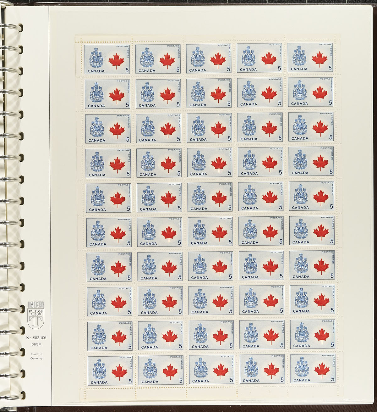 Mint Sheet Holding Part 1. An old-time mint sheet holding with 72 complete NH sheets ranging from the 1947 "Citizenship" issue up to the 1968 "Voyage of the Nonsuch" (#275/482). Primarily in sheets of 50, with a few sheets of 100 including a Winnipeg Tagged 5c QEII Centennial sheet (458p). Most are philatelic stock, with inscription blocks. Some minor duplication, but with some of the duplicates being selected for either different pane positions / different plate numbers. An old-time holding, totally unchecked for better paper types which occur regularly during this period. All neatly housed within a hingleless Linder album, with slipcase. Valued for the total face value alone, but certainly worth more as complete sheets. Total face value =