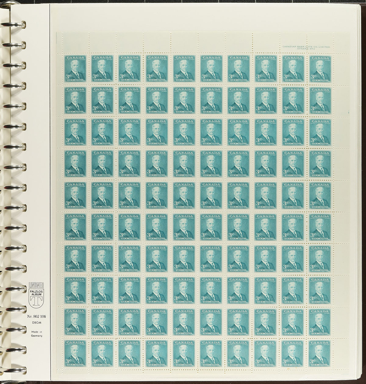Mint Sheet Holding Part 1. An old-time mint sheet holding with 72 complete NH sheets ranging from the 1947 "Citizenship" issue up to the 1968 "Voyage of the Nonsuch" (#275/482). Primarily in sheets of 50, with a few sheets of 100 including a Winnipeg Tagged 5c QEII Centennial sheet (458p). Most are philatelic stock, with inscription blocks. Some minor duplication, but with some of the duplicates being selected for either different pane positions / different plate numbers. An old-time holding, totally unchecked for better paper types which occur regularly during this period. All neatly housed within a hingleless Linder album, with slipcase. Valued for the total face value alone, but certainly worth more as complete sheets. Total face value =