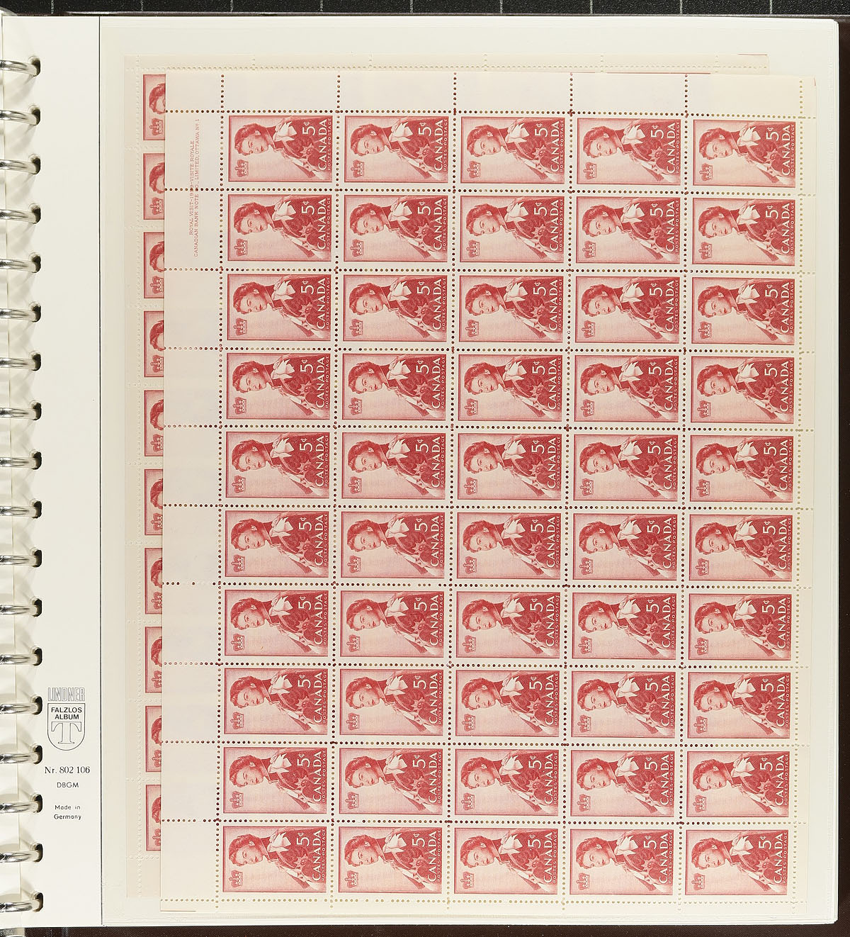 Mint Sheet Holding Part 1. An old-time mint sheet holding with 72 complete NH sheets ranging from the 1947 "Citizenship" issue up to the 1968 "Voyage of the Nonsuch" (#275/482). Primarily in sheets of 50, with a few sheets of 100 including a Winnipeg Tagged 5c QEII Centennial sheet (458p). Most are philatelic stock, with inscription blocks. Some minor duplication, but with some of the duplicates being selected for either different pane positions / different plate numbers. An old-time holding, totally unchecked for better paper types which occur regularly during this period. All neatly housed within a hingleless Linder album, with slipcase. Valued for the total face value alone, but certainly worth more as complete sheets. Total face value =