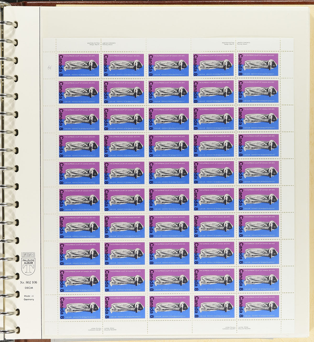Mint Sheet Holding Part 2. An old-time mint sheet holding with 62 complete NH sheets ranging from the 1968 "Lacrosse Players" to 1977 "Parliamentary Conference" (#483/740). Primarily in sheets of 50, but also with some smaller panes (1972 Earth Sciences, 1975/1976 high-value Olympics). A combination of both field stock with no inscriptions, and philatelic stock with inscription blocks. Only a couple duplicates here, mostly all-different. An old-time holding, totally unchecked for better paper types which occur regularly during this period. All neatly housed within a hingleless Linder album, with slipcase. Valued for the total face value alone, but certainly worth more as complete sheets. Total face value =