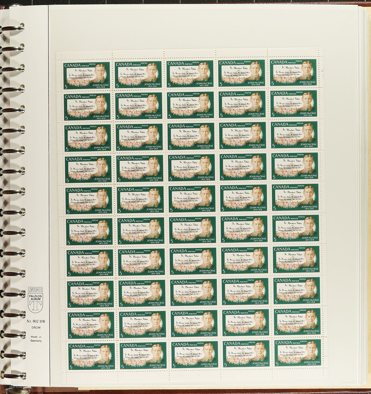 Mint Sheet Holding Part 2. An old-time mint sheet holding with 62 complete NH sheets ranging from the 1968 "Lacrosse Players" to 1977 "Parliamentary Conference" (#483/740). Primarily in sheets of 50, but also with some smaller panes (1972 Earth Sciences, 1975/1976 high-value Olympics). A combination of both field stock with no inscriptions, and philatelic stock with inscription blocks. Only a couple duplicates here, mostly all-different. An old-time holding, totally unchecked for better paper types which occur regularly during this period. All neatly housed within a hingleless Linder album, with slipcase. Valued for the total face value alone, but certainly worth more as complete sheets. Total face value =