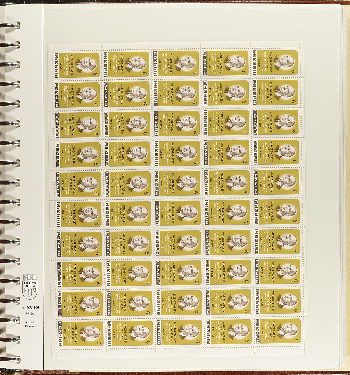 Mint Sheet Holding Part 2. An old-time mint sheet holding with 62 complete NH sheets ranging from the 1968 "Lacrosse Players" to 1977 "Parliamentary Conference" (#483/740). Primarily in sheets of 50, but also with some smaller panes (1972 Earth Sciences, 1975/1976 high-value Olympics). A combination of both field stock with no inscriptions, and philatelic stock with inscription blocks. Only a couple duplicates here, mostly all-different. An old-time holding, totally unchecked for better paper types which occur regularly during this period. All neatly housed within a hingleless Linder album, with slipcase. Valued for the total face value alone, but certainly worth more as complete sheets. Total face value =
