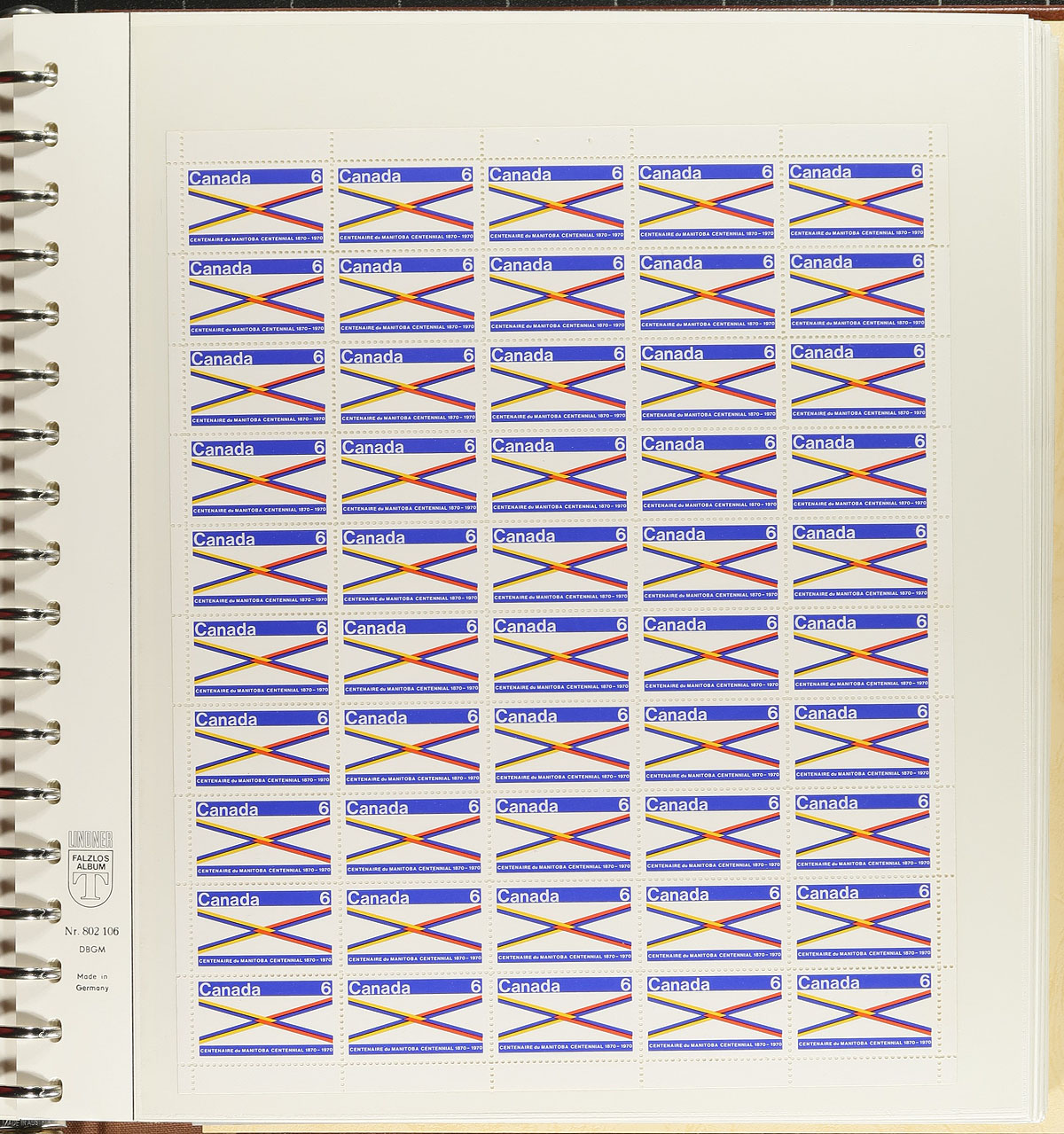 Mint Sheet Holding Part 2. An old-time mint sheet holding with 62 complete NH sheets ranging from the 1968 "Lacrosse Players" to 1977 "Parliamentary Conference" (#483/740). Primarily in sheets of 50, but also with some smaller panes (1972 Earth Sciences, 1975/1976 high-value Olympics). A combination of both field stock with no inscriptions, and philatelic stock with inscription blocks. Only a couple duplicates here, mostly all-different. An old-time holding, totally unchecked for better paper types which occur regularly during this period. All neatly housed within a hingleless Linder album, with slipcase. Valued for the total face value alone, but certainly worth more as complete sheets. Total face value =