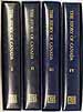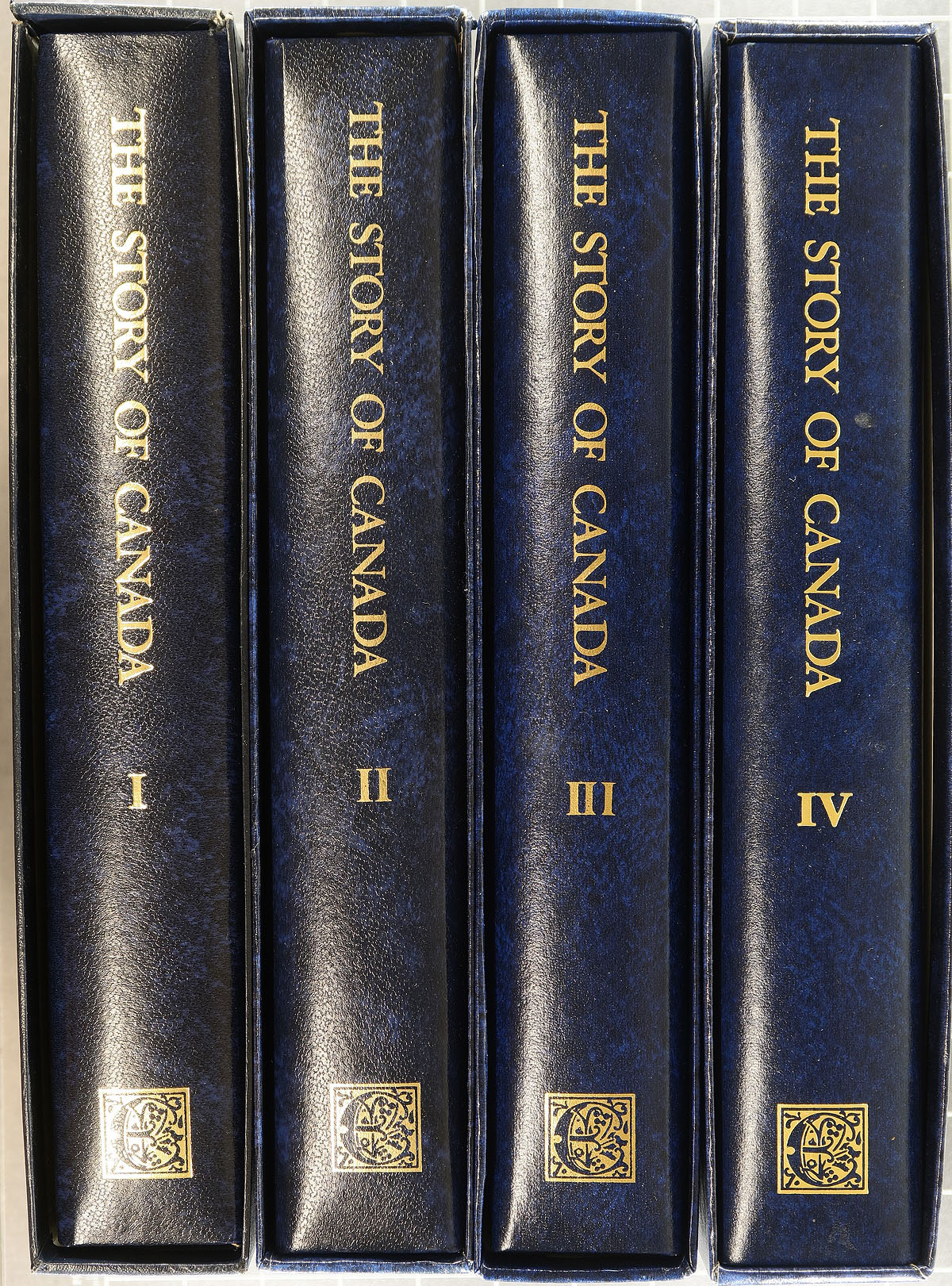 The Story of Canada Collection. The complete four volume collection of 83 different deluxe gold cacheted First Day covers making up "The Story of Canada" Excelsior Collector's Guild set. Each FDC is on a special page and includes a mint Canadian stamp (different from the stamp on FDC) that ties into the story of the FDC. An attractive, informative and hugely expensive early 1980's production (original issue cost of this lot was probably well over $800.00). Estimate =