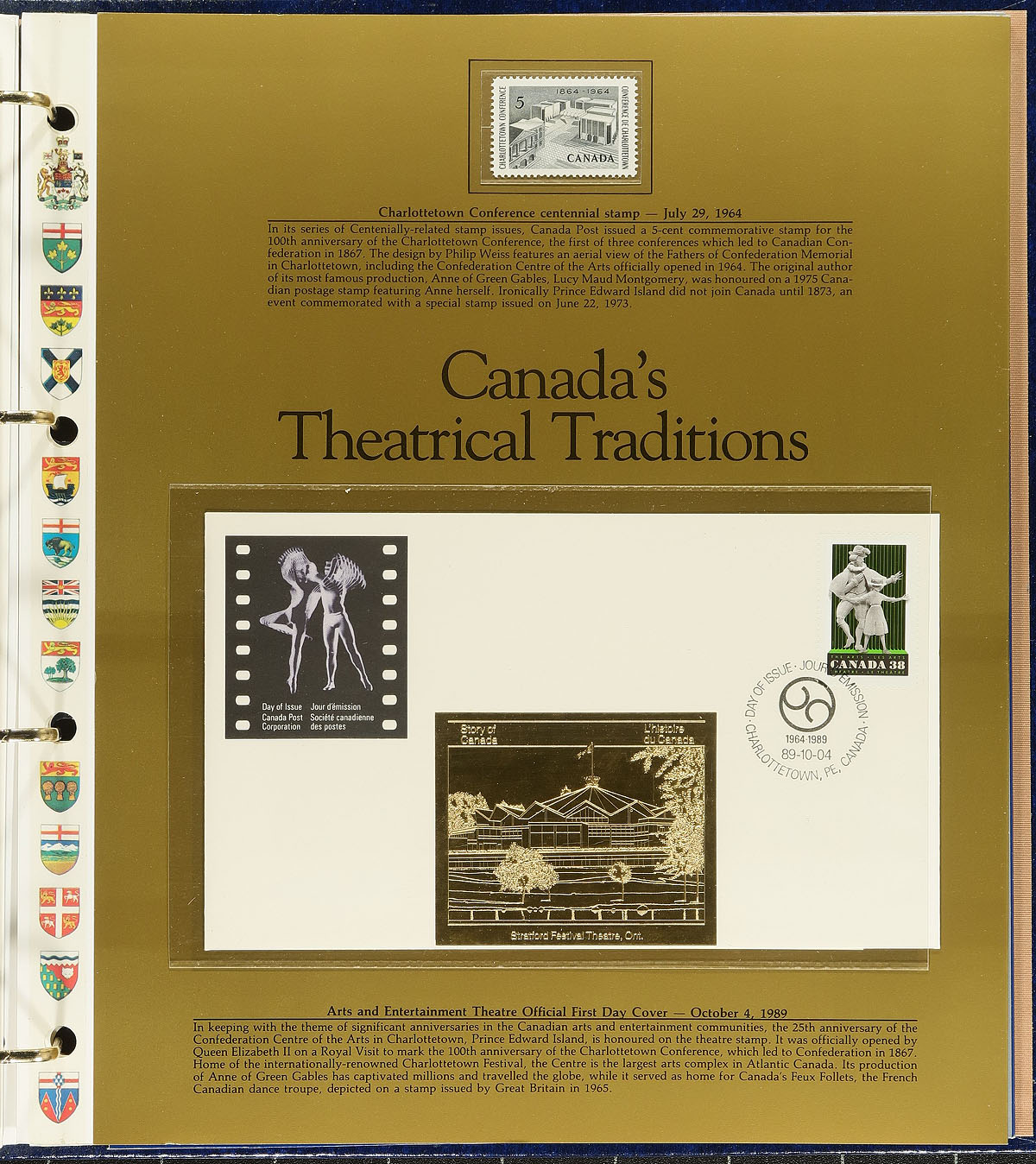The Story of Canada Collection. The complete four volume collection of 83 different deluxe gold cacheted First Day covers making up "The Story of Canada" Excelsior Collector's Guild set. Each FDC is on a special page and includes a mint Canadian stamp (different from the stamp on FDC) that ties into the story of the FDC. An attractive, informative and hugely expensive early 1980's production (original issue cost of this lot was probably well over $800.00). Estimate =
