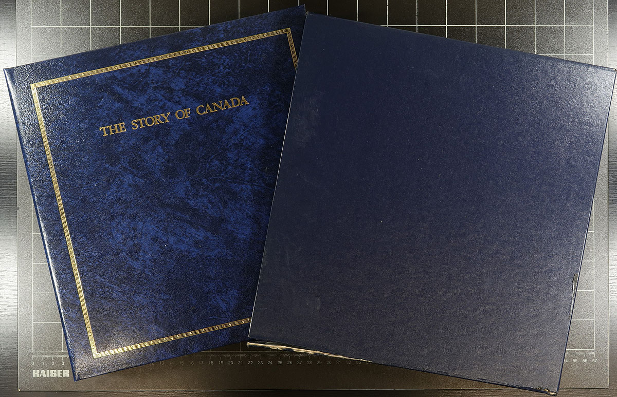 The Story of Canada Collection. The complete four volume collection of 83 different deluxe gold cacheted First Day covers making up "The Story of Canada" Excelsior Collector's Guild set. Each FDC is on a special page and includes a mint Canadian stamp (different from the stamp on FDC) that ties into the story of the FDC. An attractive, informative and hugely expensive early 1980's production (original issue cost of this lot was probably well over $800.00). Estimate =