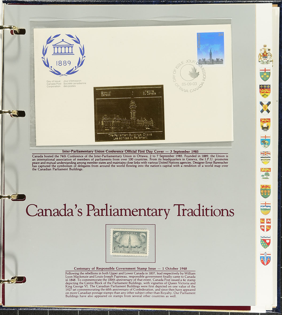 The Story of Canada Collection. The complete four volume collection of 83 different deluxe gold cacheted First Day covers making up "The Story of Canada" Excelsior Collector's Guild set. Each FDC is on a special page and includes a mint Canadian stamp (different from the stamp on FDC) that ties into the story of the FDC. An attractive, informative and hugely expensive early 1980's production (original issue cost of this lot was probably well over $800.00). Estimate =