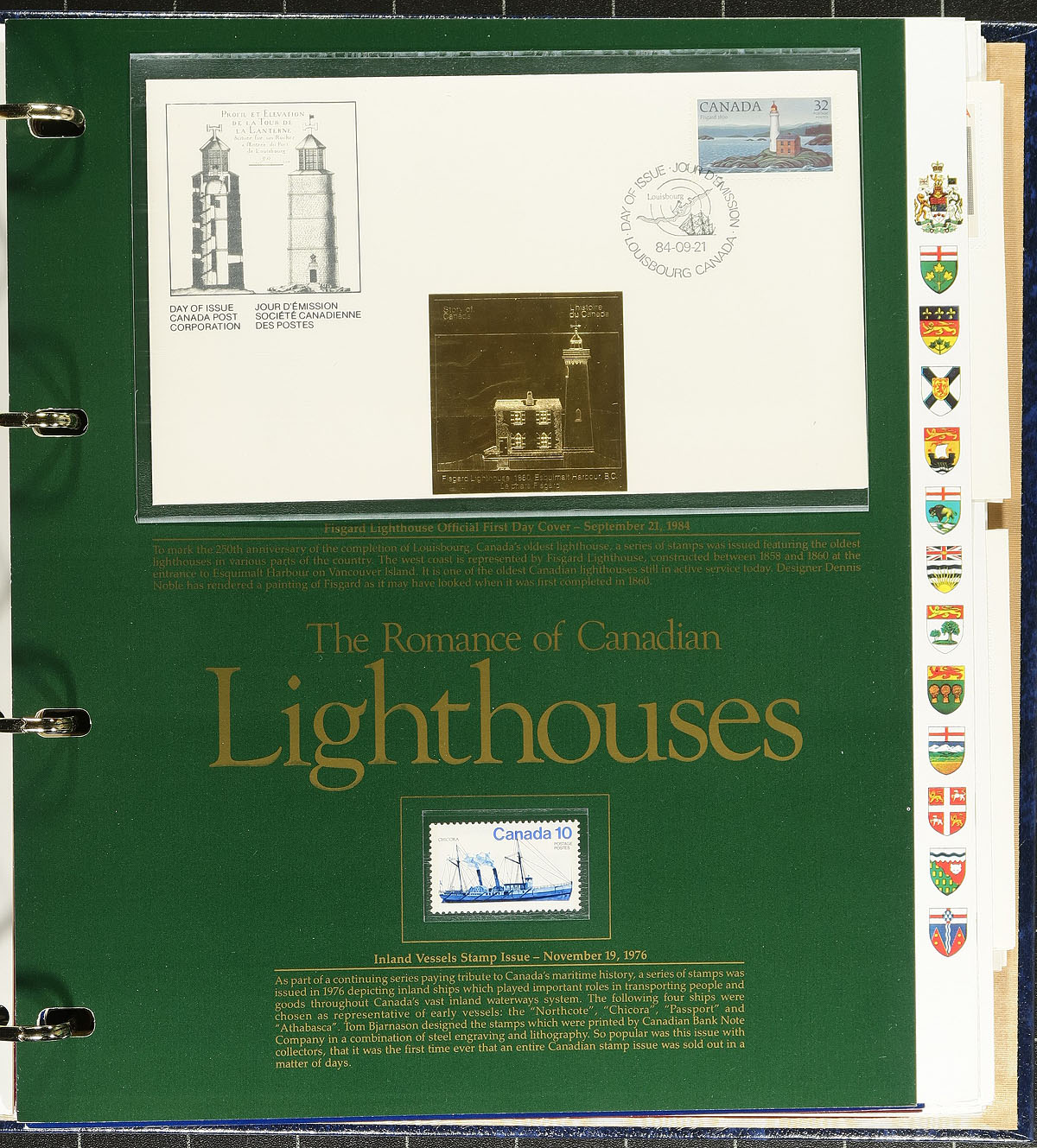 The Story of Canada Collection. The complete four volume collection of 83 different deluxe gold cacheted First Day covers making up "The Story of Canada" Excelsior Collector's Guild set. Each FDC is on a special page and includes a mint Canadian stamp (different from the stamp on FDC) that ties into the story of the FDC. An attractive, informative and hugely expensive early 1980's production (original issue cost of this lot was probably well over $800.00). Estimate =