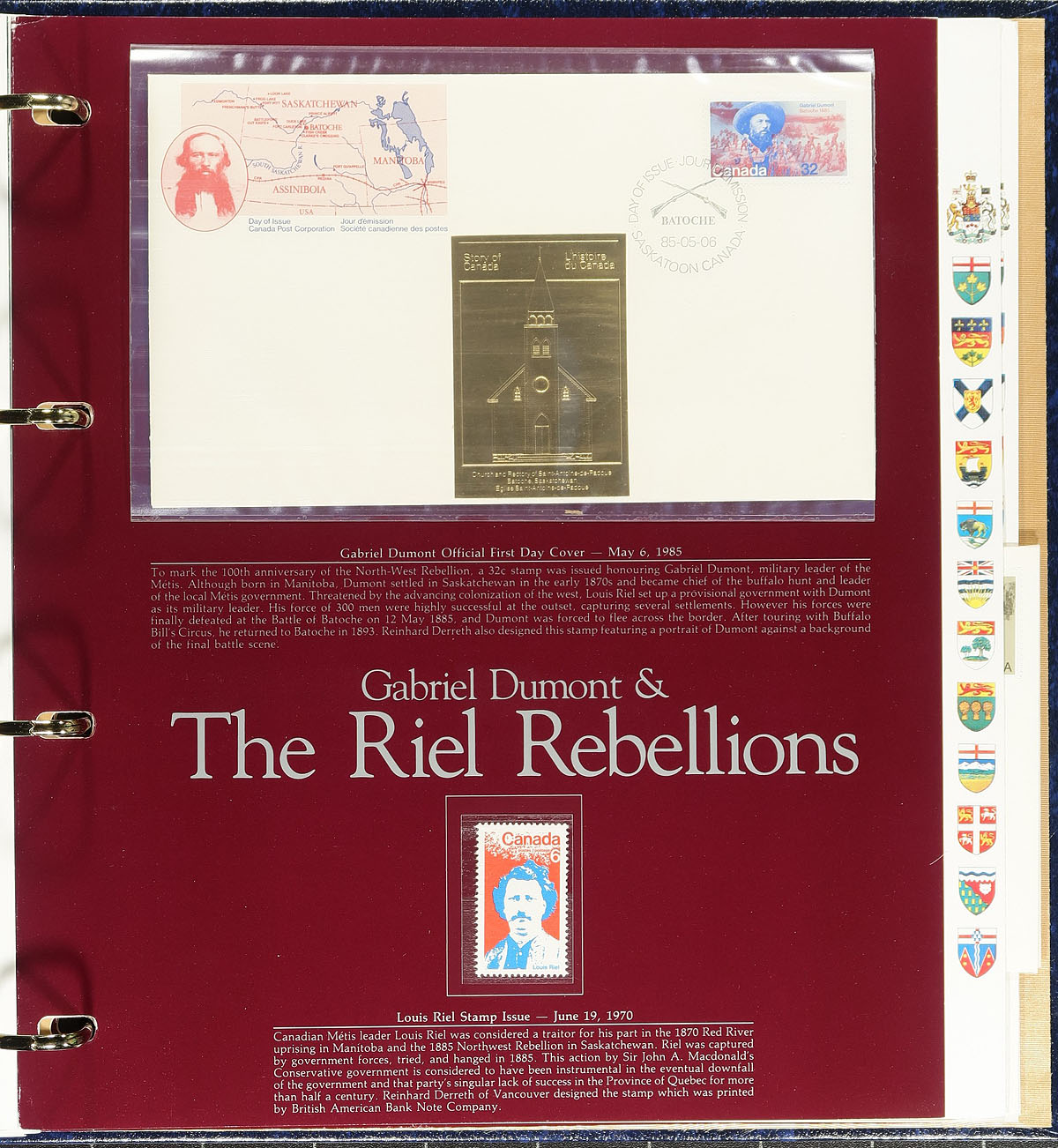 The Story of Canada Collection. The complete four volume collection of 83 different deluxe gold cacheted First Day covers making up "The Story of Canada" Excelsior Collector's Guild set. Each FDC is on a special page and includes a mint Canadian stamp (different from the stamp on FDC) that ties into the story of the FDC. An attractive, informative and hugely expensive early 1980's production (original issue cost of this lot was probably well over $800.00). Estimate =