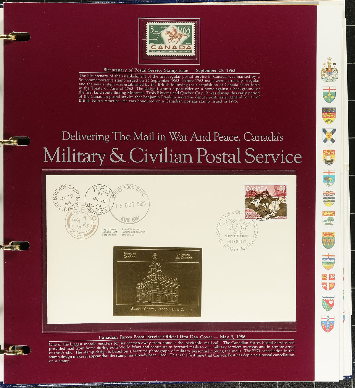The Story of Canada Collection. The complete four volume collection of 83 different deluxe gold cacheted First Day covers making up "The Story of Canada" Excelsior Collector's Guild set. Each FDC is on a special page and includes a mint Canadian stamp (different from the stamp on FDC) that ties into the story of the FDC. An attractive, informative and hugely expensive early 1980's production (original issue cost of this lot was probably well over $800.00). Estimate =