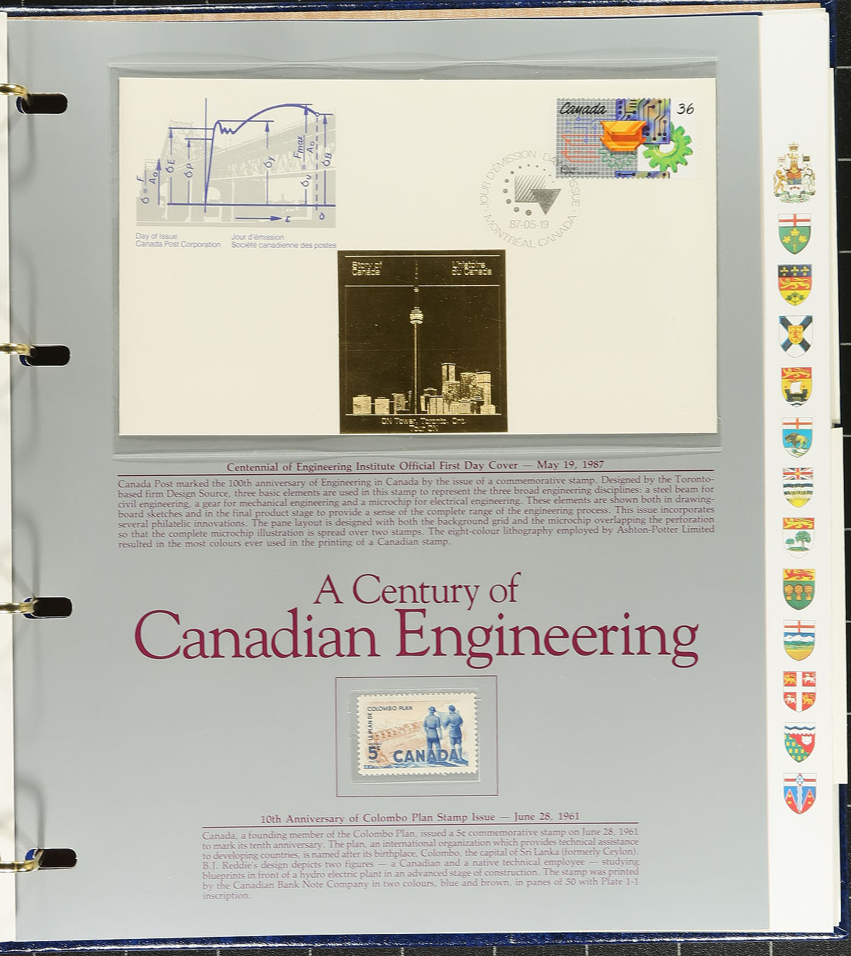 The Story of Canada Collection. The complete four volume collection of 83 different deluxe gold cacheted First Day covers making up "The Story of Canada" Excelsior Collector's Guild set. Each FDC is on a special page and includes a mint Canadian stamp (different from the stamp on FDC) that ties into the story of the FDC. An attractive, informative and hugely expensive early 1980's production (original issue cost of this lot was probably well over $800.00). Estimate =