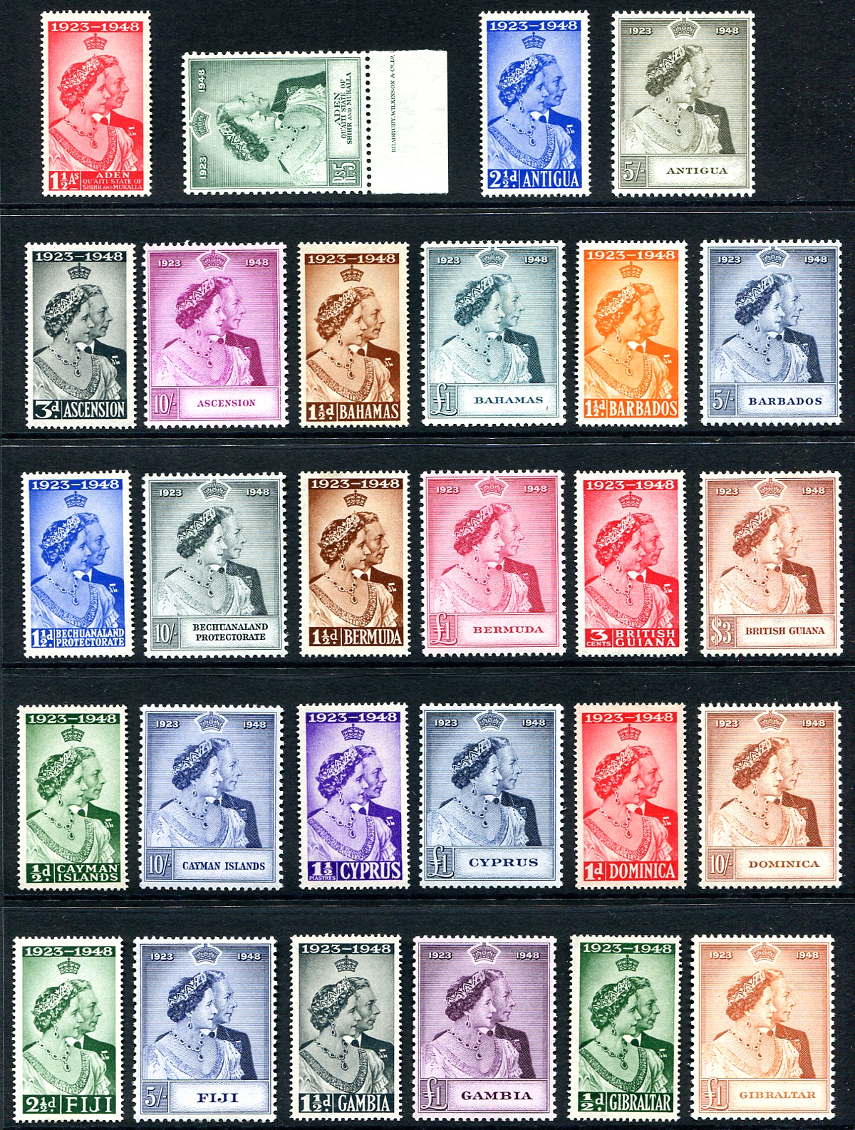 Attractive assembly of 30 different mint sets, mostly Lightly Hinged from the 1948 Silver Wedding Omnibus (common design) series, neatly arranged on two stockpages. Several better here, and included are Never Hinged sets of Aden, Ascension, British Guiana, Cayman Islands, Nyasaland and Kuwait. A wonderful assembly for the British Commonwealth collector. 2025 Scott US$995.70 =