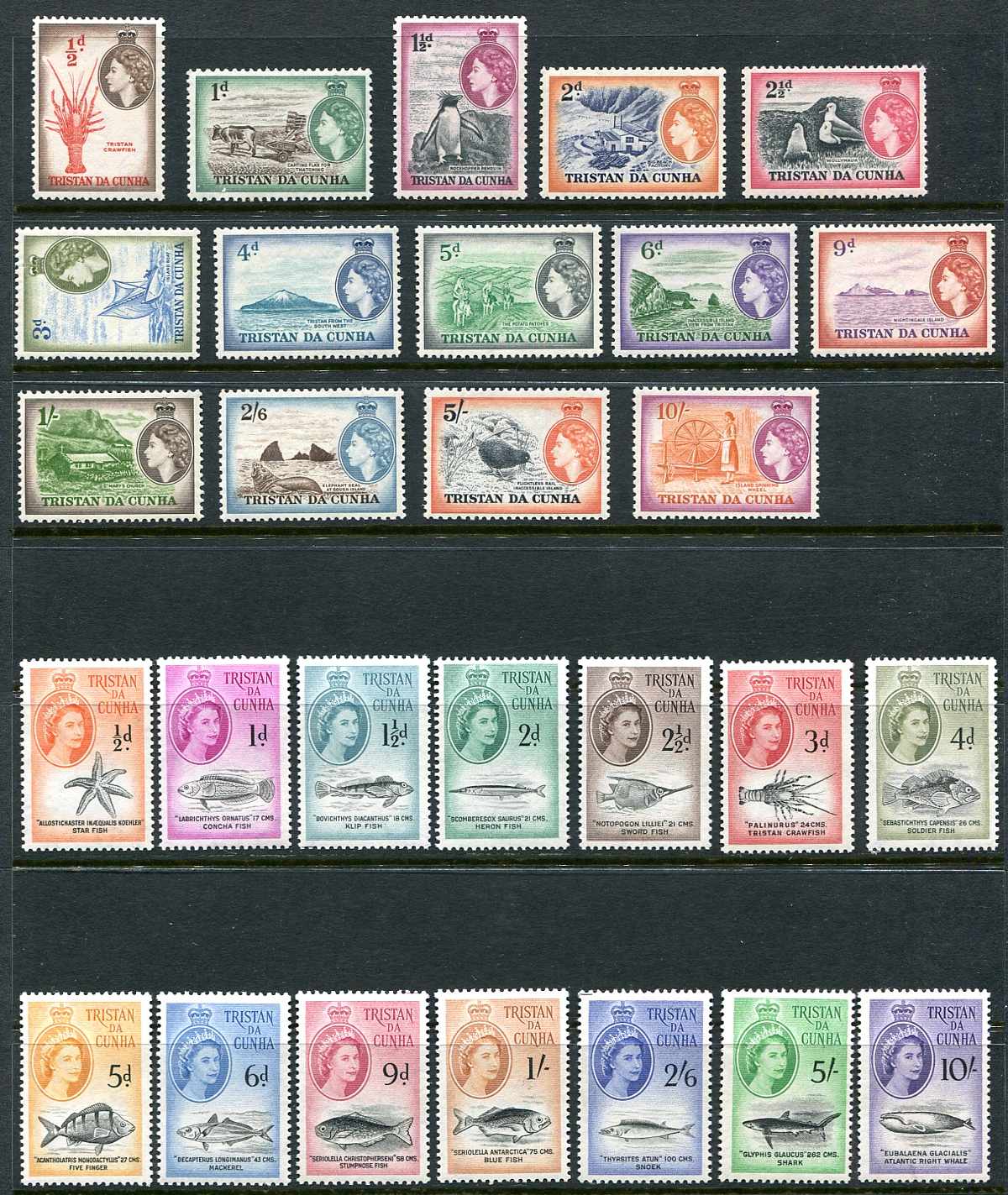 VF mint Never Hinged duo of complete QEII sets including the 1954-1958 Pictorial series of 14 stamps and 1960 "Fish" series of 14 stamps. All neatly arranged on a single stockpage. 2025 Scott US$173.15 =