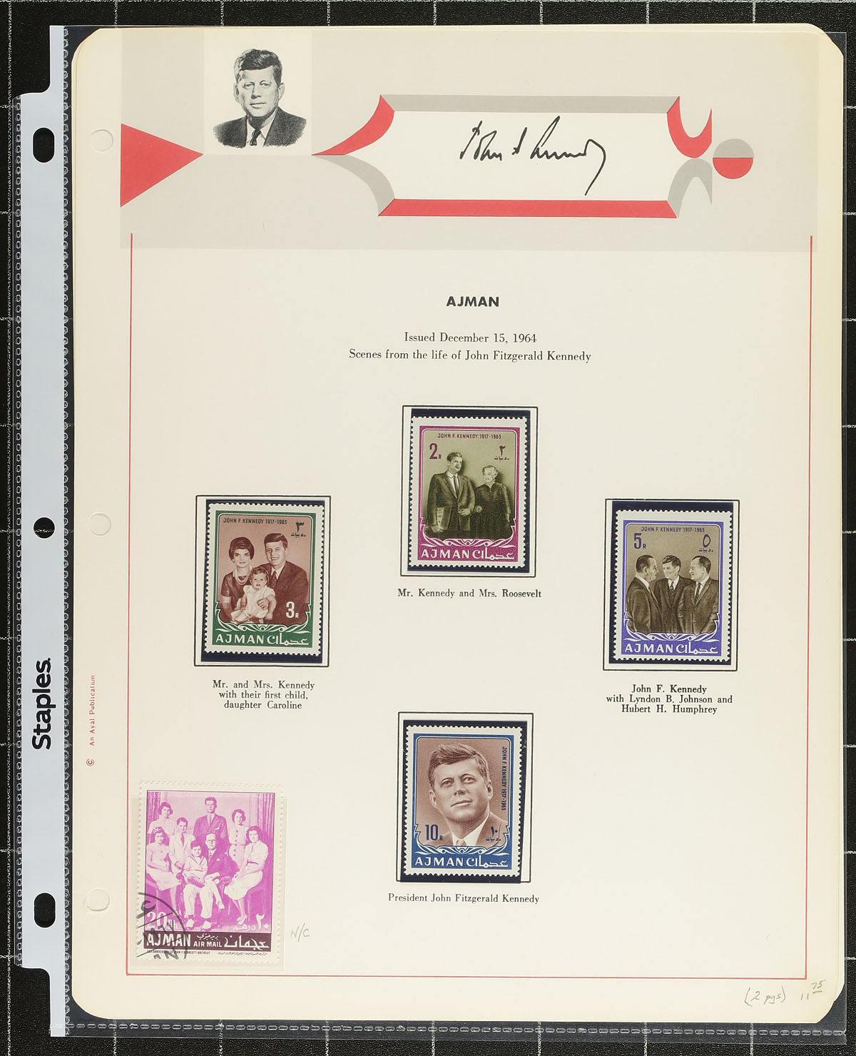 Kennedy Memorial Topical Collection. An intriguing collection of JFK memorial stamps, from a variety of Nations including Central Africa, Congo, Honduras, Sharjah, Umm Al Qiwain, Cameroon, Mali, Guinea, Jordan, Mexico, Panama, Sierra Leone, Ras Al Khaima, etc. A variety of formats including singles, souvenir sheets, sets and covers. Best is the Cameroun 1969 C111-C116 Type I overprint (also featuring Gandhi and Martin Luther King) which catalogues US$300.00 alone. All identified on pages / stockpages, with several "odd balls" not valued. 2025 Scott US$669.05 =