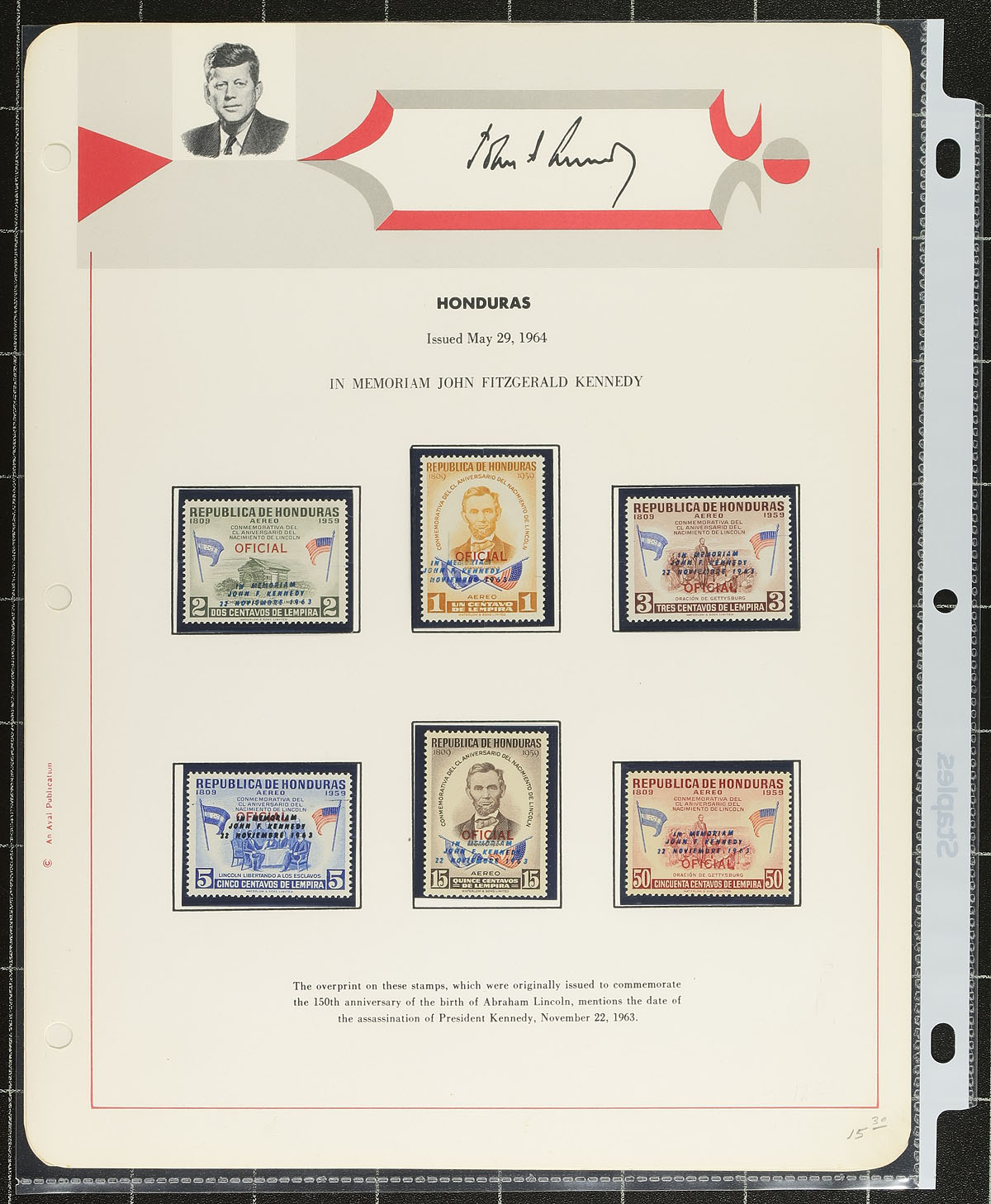 Kennedy Memorial Topical Collection. An intriguing collection of JFK memorial stamps, from a variety of Nations including Central Africa, Congo, Honduras, Sharjah, Umm Al Qiwain, Cameroon, Mali, Guinea, Jordan, Mexico, Panama, Sierra Leone, Ras Al Khaima, etc. A variety of formats including singles, souvenir sheets, sets and covers. Best is the Cameroun 1969 C111-C116 Type I overprint (also featuring Gandhi and Martin Luther King) which catalogues US$300.00 alone. All identified on pages / stockpages, with several "odd balls" not valued. 2025 Scott US$669.05 =