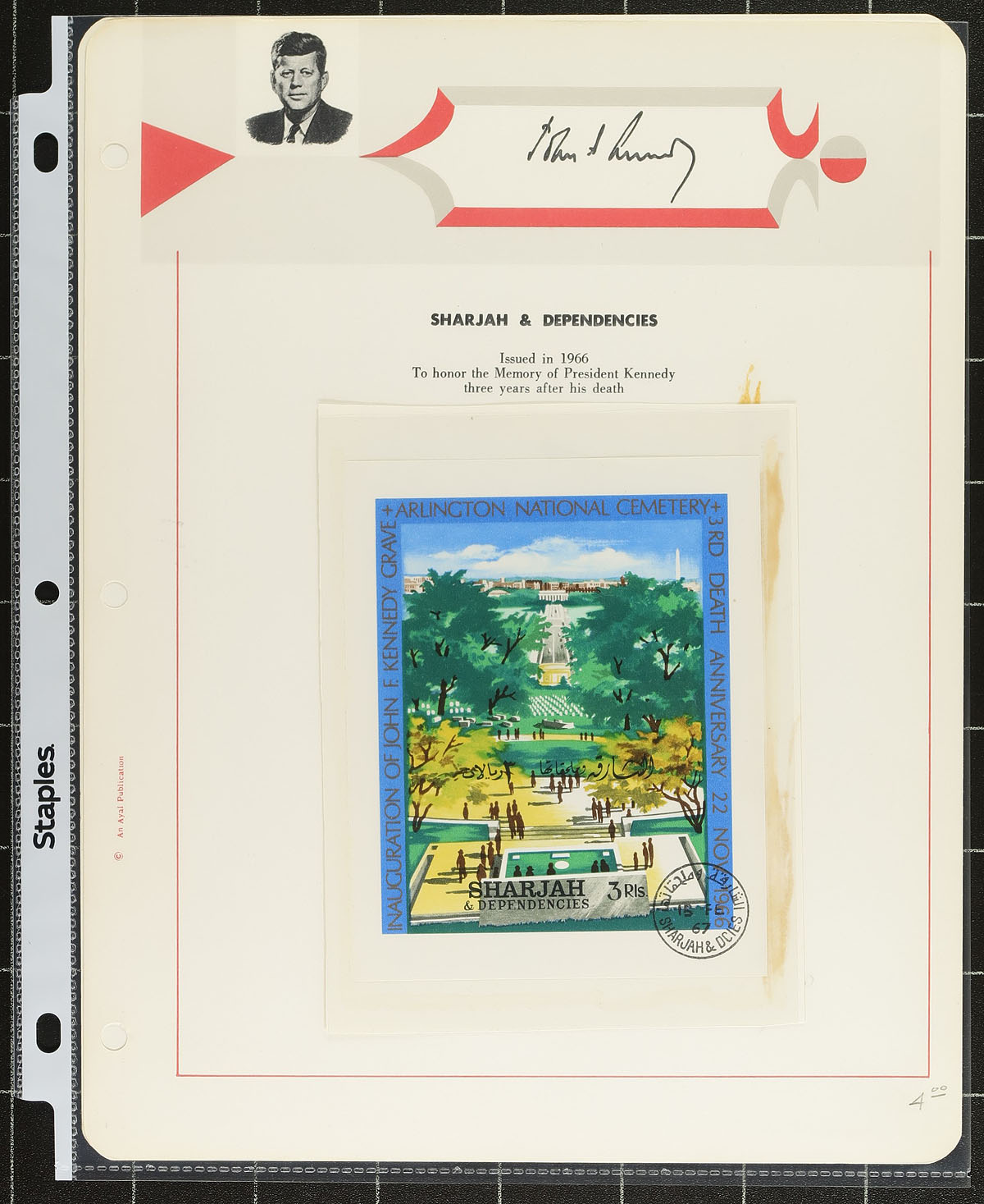 Kennedy Memorial Topical Collection. An intriguing collection of JFK memorial stamps, from a variety of Nations including Central Africa, Congo, Honduras, Sharjah, Umm Al Qiwain, Cameroon, Mali, Guinea, Jordan, Mexico, Panama, Sierra Leone, Ras Al Khaima, etc. A variety of formats including singles, souvenir sheets, sets and covers. Best is the Cameroun 1969 C111-C116 Type I overprint (also featuring Gandhi and Martin Luther King) which catalogues US$300.00 alone. All identified on pages / stockpages, with several "odd balls" not valued. 2025 Scott US$669.05 =