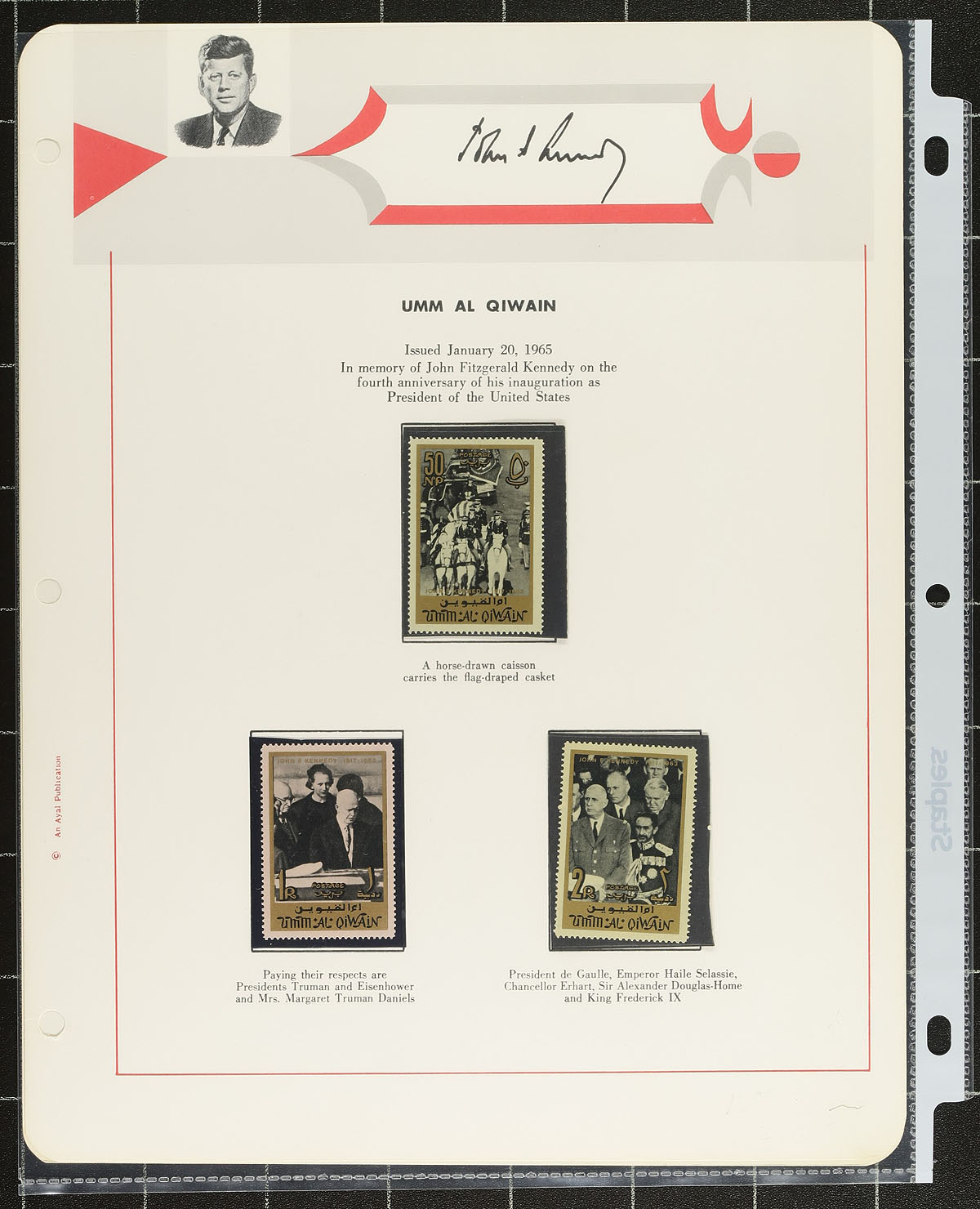 Kennedy Memorial Topical Collection. An intriguing collection of JFK memorial stamps, from a variety of Nations including Central Africa, Congo, Honduras, Sharjah, Umm Al Qiwain, Cameroon, Mali, Guinea, Jordan, Mexico, Panama, Sierra Leone, Ras Al Khaima, etc. A variety of formats including singles, souvenir sheets, sets and covers. Best is the Cameroun 1969 C111-C116 Type I overprint (also featuring Gandhi and Martin Luther King) which catalogues US$300.00 alone. All identified on pages / stockpages, with several "odd balls" not valued. 2025 Scott US$669.05 =