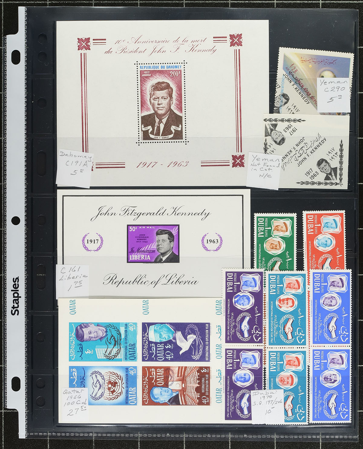 Kennedy Memorial Topical Collection. An intriguing collection of JFK memorial stamps, from a variety of Nations including Central Africa, Congo, Honduras, Sharjah, Umm Al Qiwain, Cameroon, Mali, Guinea, Jordan, Mexico, Panama, Sierra Leone, Ras Al Khaima, etc. A variety of formats including singles, souvenir sheets, sets and covers. Best is the Cameroun 1969 C111-C116 Type I overprint (also featuring Gandhi and Martin Luther King) which catalogues US$300.00 alone. All identified on pages / stockpages, with several "odd balls" not valued. 2025 Scott US$669.05 =