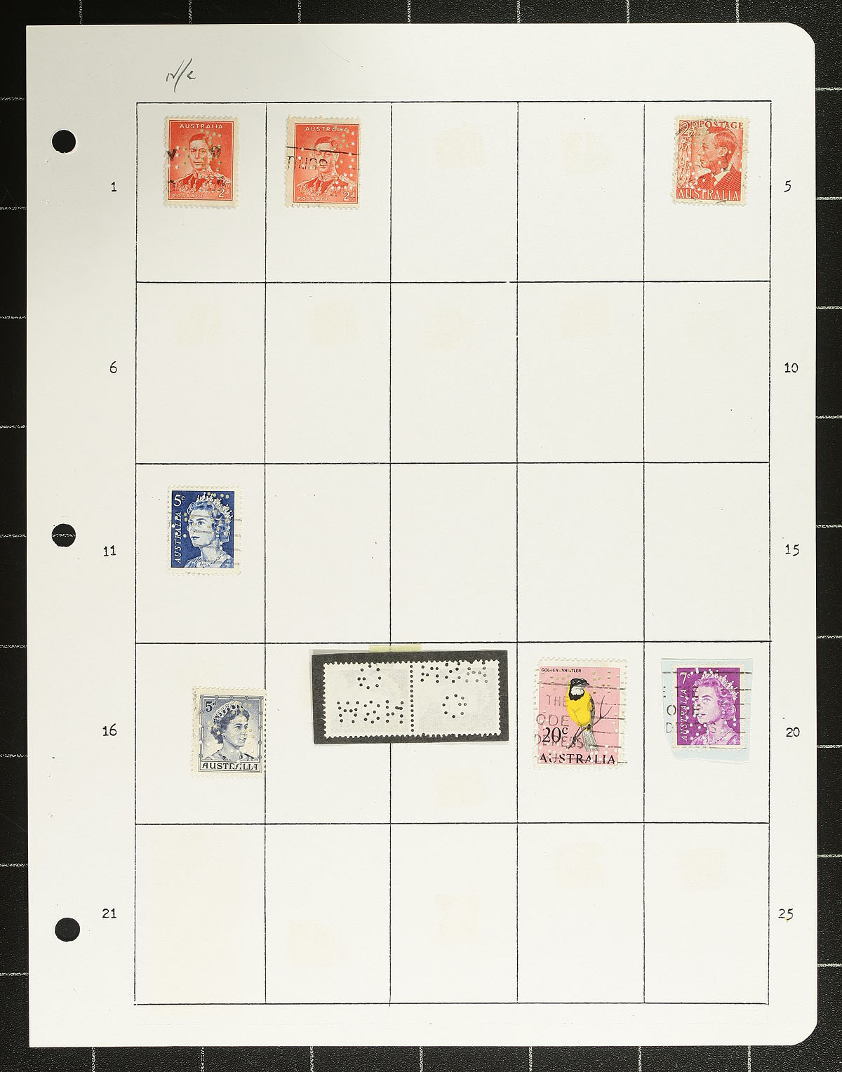 Assemble of 140 used stamps with either "OS" overprint or "OS" / "NSW OS" perfins on Roos and George V heads. Some minor duplication and neatly arranged and identified on pages (for what the owner could do). A total of 72 stamps are priced (2024 Scott US$423.55), and 68 stamps are not priced / catalogued. An interesting assembly to work through. Estimate =