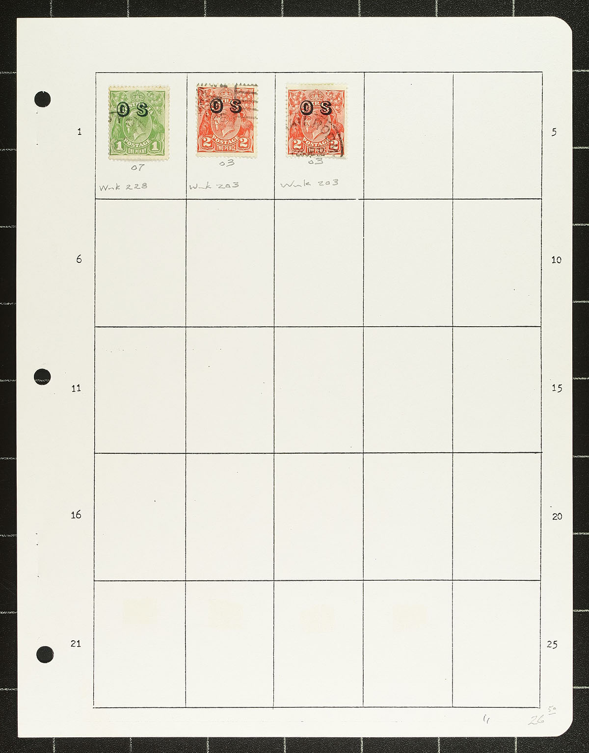 Assemble of 140 used stamps with either "OS" overprint or "OS" / "NSW OS" perfins on Roos and George V heads. Some minor duplication and neatly arranged and identified on pages (for what the owner could do). A total of 72 stamps are priced (2024 Scott US$423.55), and 68 stamps are not priced / catalogued. An interesting assembly to work through. Estimate =