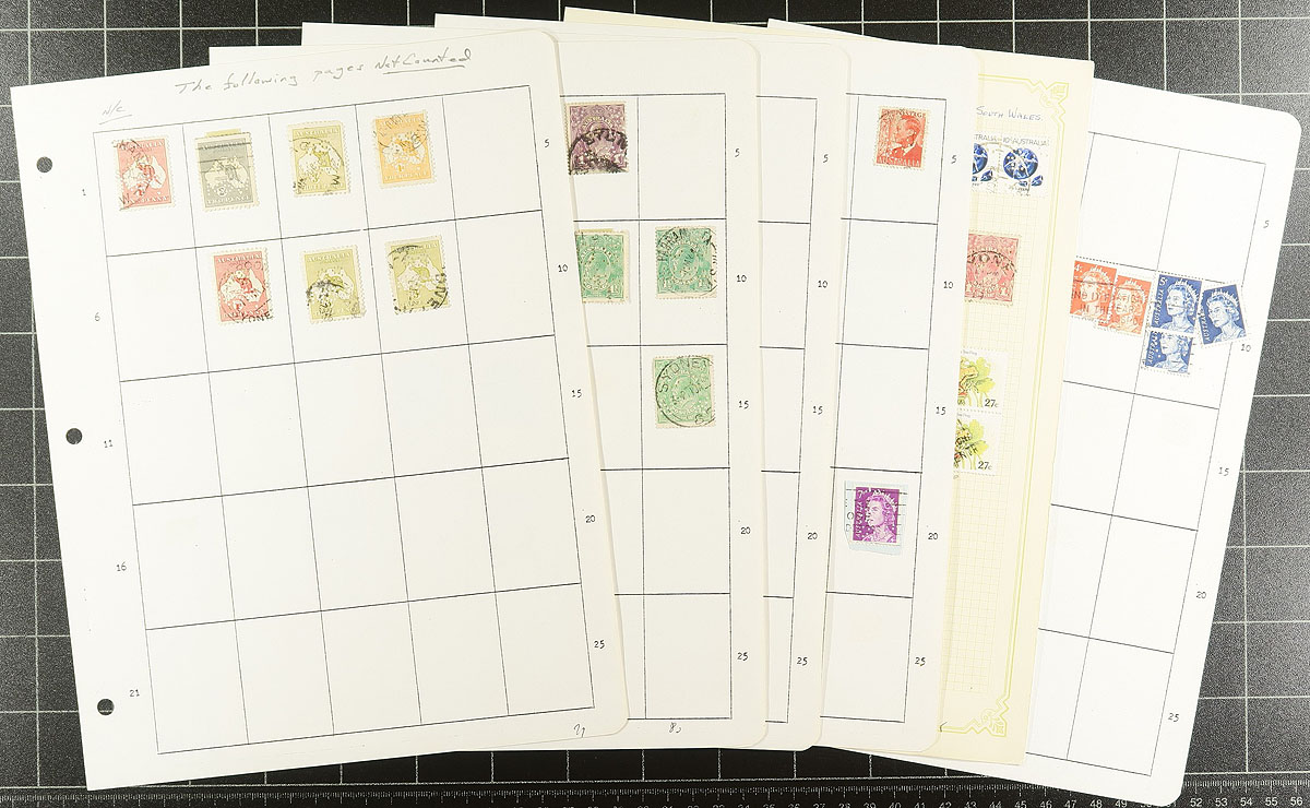 Assemble of 140 used stamps with either "OS" overprint or "OS" / "NSW OS" perfins on Roos and George V heads. Some minor duplication and neatly arranged and identified on pages (for what the owner could do). A total of 72 stamps are priced (2024 Scott US$423.55), and 68 stamps are not priced / catalogued. An interesting assembly to work through. Estimate =