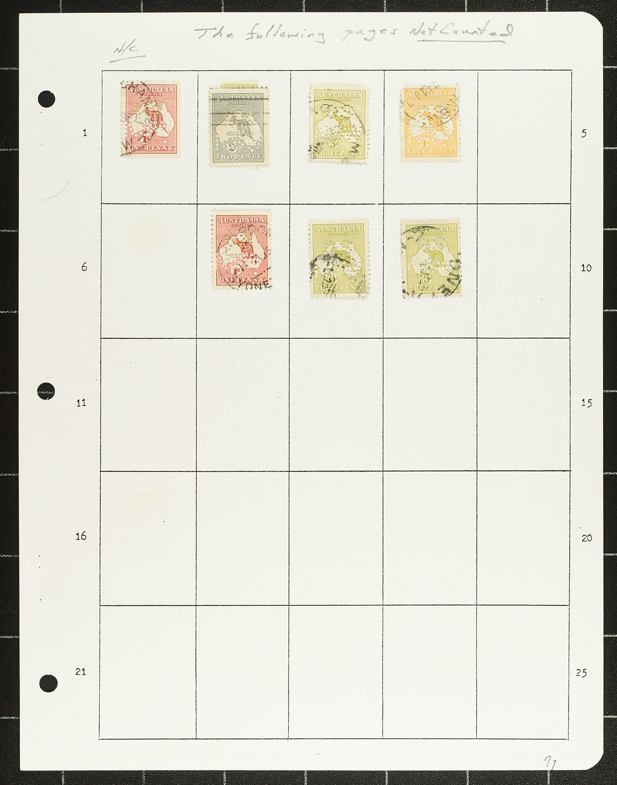 Assemble of 140 used stamps with either "OS" overprint or "OS" / "NSW OS" perfins on Roos and George V heads. Some minor duplication and neatly arranged and identified on pages (for what the owner could do). A total of 72 stamps are priced (2024 Scott US$423.55), and 68 stamps are not priced / catalogued. An interesting assembly to work through. Estimate =