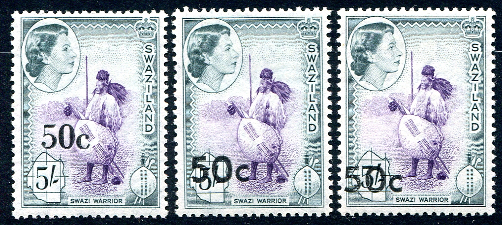 VF mint Lightly Hinged trio of different surcharge settings of the 50c overprinted 5sh "Swazi Warrior" stamps. This represent all three surcharge types (I, II, II) with Type II being the sought-after seldom seen setting. 2025 Scott US$734.95 =