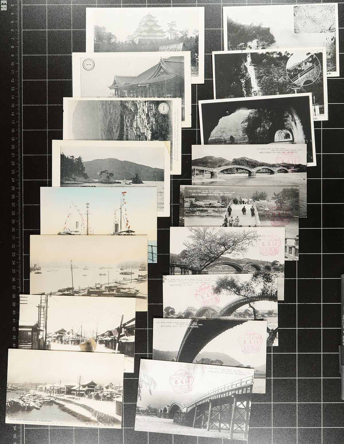 Japan. A collector's accumulation of 85 postcards, with a very nice mix of "classic" pre-1920 postcards (including hand-coloured), up to the 1950's era. Of particular note, are view of the Temples, Japanese ladies and town / landscape postcards. A very clean group. Estimate =