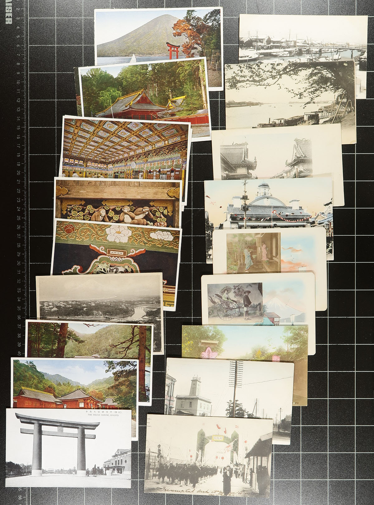 Japan. A collector's accumulation of 85 postcards, with a very nice mix of "classic" pre-1920 postcards (including hand-coloured), up to the 1950's era. Of particular note, are view of the Temples, Japanese ladies and town / landscape postcards. A very clean group. Estimate =