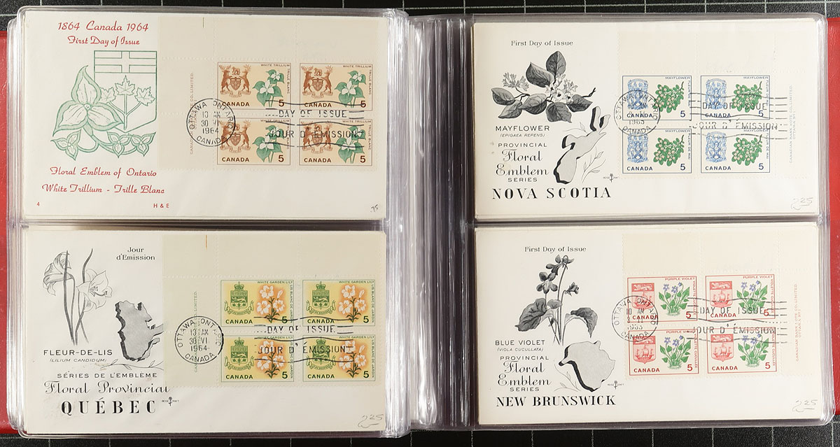 First Day Covers. An interesting assembly of 99 FDC from the 1957-1967 period, including primarily private illustrated cachets (a few with no cachet). A very clean assembly with almost all being either blocks of four, or plate blocks of four. Of particular note are the 1963 Export $1.00 high-value plate block and set of QEII Centennial mid-high value plate block FDC (including two different plate block corners of the 50c value). Estimate =