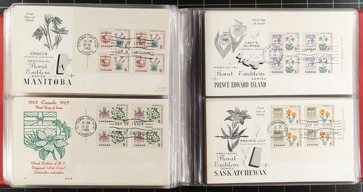 First Day Covers. An interesting assembly of 99 FDC from the 1957-1967 period, including primarily private illustrated cachets (a few with no cachet). A very clean assembly with almost all being either blocks of four, or plate blocks of four. Of particular note are the 1963 Export $1.00 high-value plate block and set of QEII Centennial mid-high value plate block FDC (including two different plate block corners of the 50c value). Estimate =