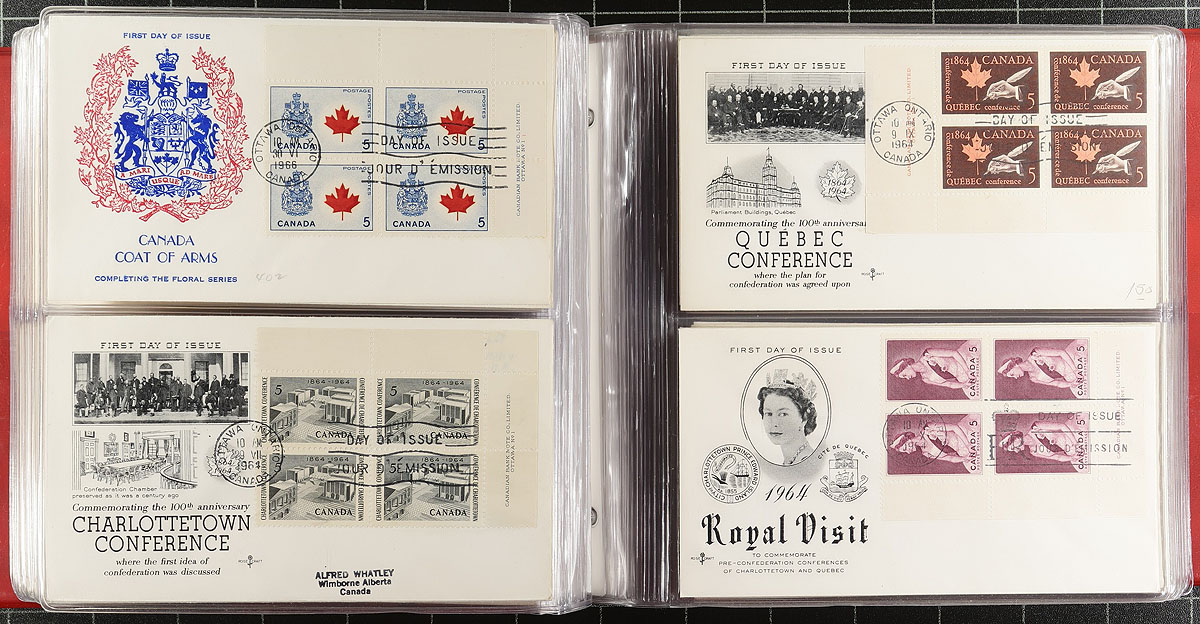 First Day Covers. An interesting assembly of 99 FDC from the 1957-1967 period, including primarily private illustrated cachets (a few with no cachet). A very clean assembly with almost all being either blocks of four, or plate blocks of four. Of particular note are the 1963 Export $1.00 high-value plate block and set of QEII Centennial mid-high value plate block FDC (including two different plate block corners of the 50c value). Estimate =