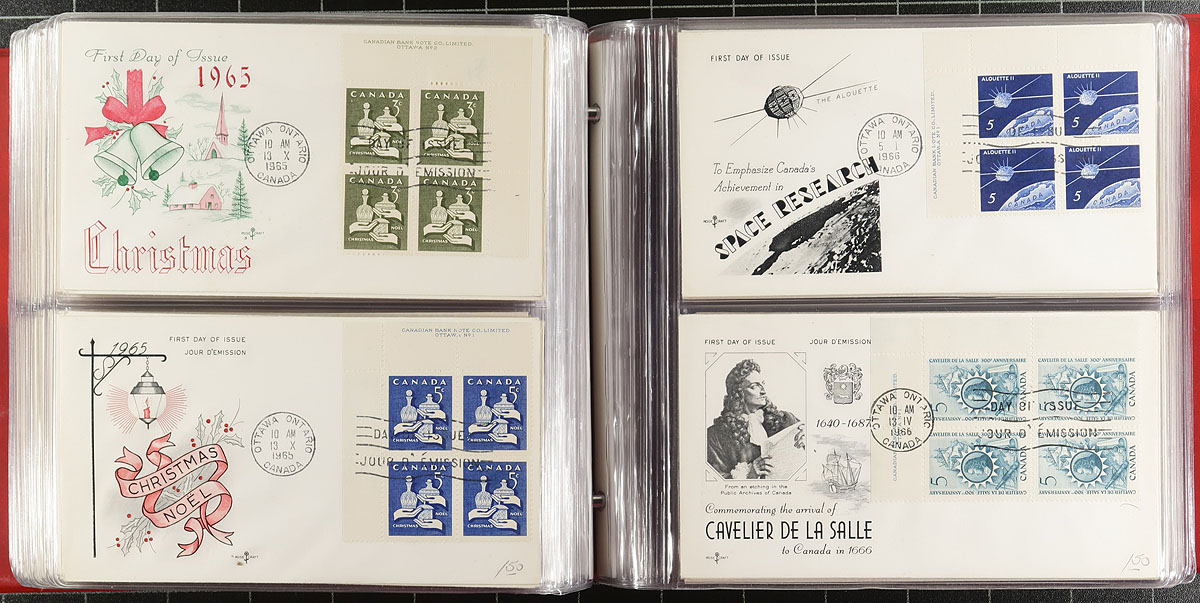 First Day Covers. An interesting assembly of 99 FDC from the 1957-1967 period, including primarily private illustrated cachets (a few with no cachet). A very clean assembly with almost all being either blocks of four, or plate blocks of four. Of particular note are the 1963 Export $1.00 high-value plate block and set of QEII Centennial mid-high value plate block FDC (including two different plate block corners of the 50c value). Estimate =