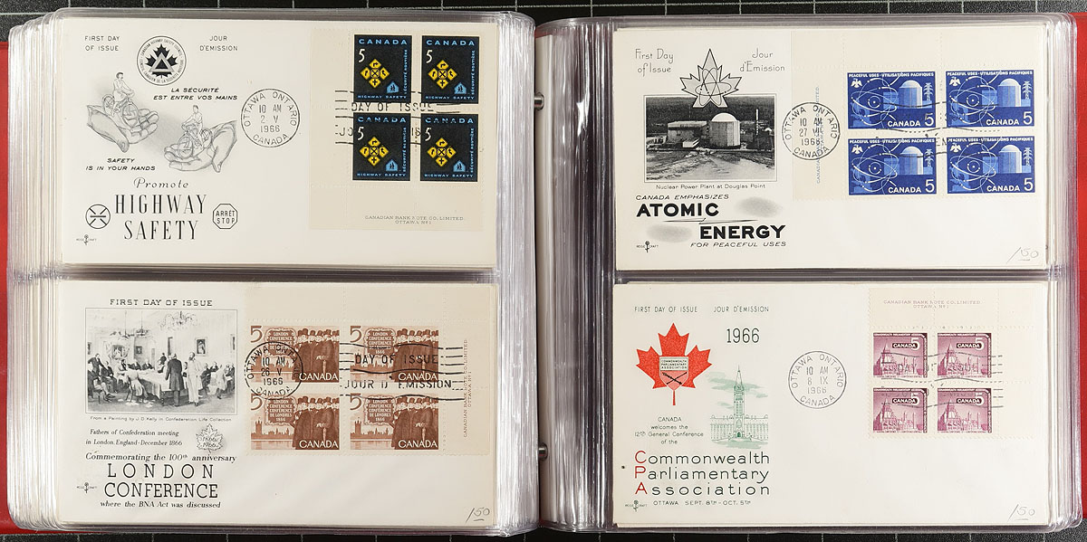 First Day Covers. An interesting assembly of 99 FDC from the 1957-1967 period, including primarily private illustrated cachets (a few with no cachet). A very clean assembly with almost all being either blocks of four, or plate blocks of four. Of particular note are the 1963 Export $1.00 high-value plate block and set of QEII Centennial mid-high value plate block FDC (including two different plate block corners of the 50c value). Estimate =