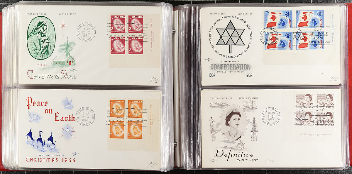 First Day Covers. An interesting assembly of 99 FDC from the 1957-1967 period, including primarily private illustrated cachets (a few with no cachet). A very clean assembly with almost all being either blocks of four, or plate blocks of four. Of particular note are the 1963 Export $1.00 high-value plate block and set of QEII Centennial mid-high value plate block FDC (including two different plate block corners of the 50c value). Estimate =