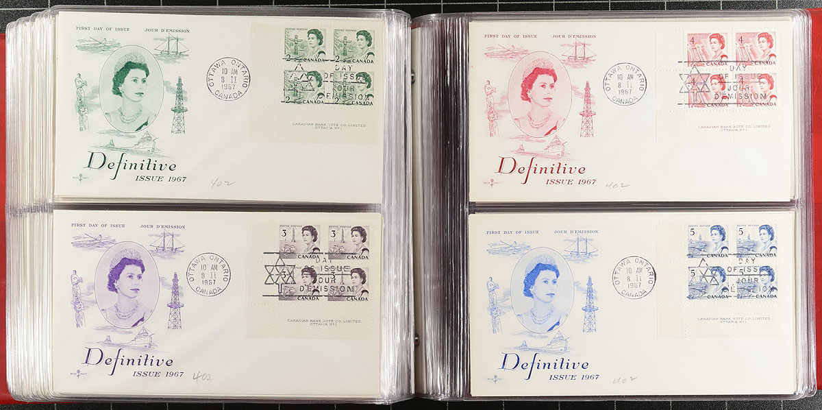 First Day Covers. An interesting assembly of 99 FDC from the 1957-1967 period, including primarily private illustrated cachets (a few with no cachet). A very clean assembly with almost all being either blocks of four, or plate blocks of four. Of particular note are the 1963 Export $1.00 high-value plate block and set of QEII Centennial mid-high value plate block FDC (including two different plate block corners of the 50c value). Estimate =