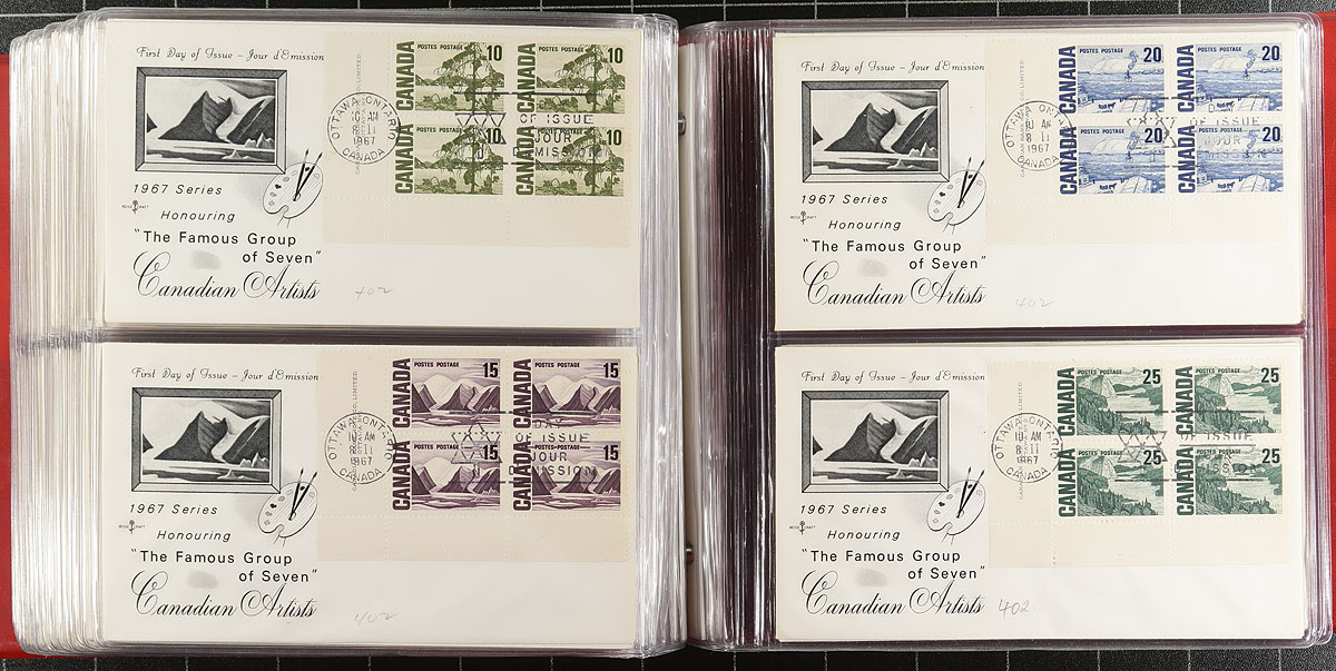 First Day Covers. An interesting assembly of 99 FDC from the 1957-1967 period, including primarily private illustrated cachets (a few with no cachet). A very clean assembly with almost all being either blocks of four, or plate blocks of four. Of particular note are the 1963 Export $1.00 high-value plate block and set of QEII Centennial mid-high value plate block FDC (including two different plate block corners of the 50c value). Estimate =