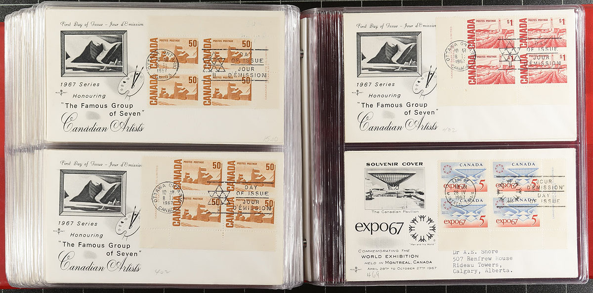 First Day Covers. An interesting assembly of 99 FDC from the 1957-1967 period, including primarily private illustrated cachets (a few with no cachet). A very clean assembly with almost all being either blocks of four, or plate blocks of four. Of particular note are the 1963 Export $1.00 high-value plate block and set of QEII Centennial mid-high value plate block FDC (including two different plate block corners of the 50c value). Estimate =