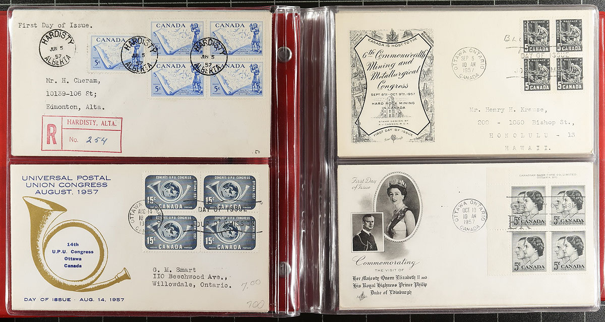 First Day Covers. An interesting assembly of 99 FDC from the 1957-1967 period, including primarily private illustrated cachets (a few with no cachet). A very clean assembly with almost all being either blocks of four, or plate blocks of four. Of particular note are the 1963 Export $1.00 high-value plate block and set of QEII Centennial mid-high value plate block FDC (including two different plate block corners of the 50c value). Estimate =
