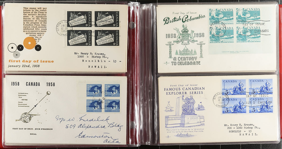 First Day Covers. An interesting assembly of 99 FDC from the 1957-1967 period, including primarily private illustrated cachets (a few with no cachet). A very clean assembly with almost all being either blocks of four, or plate blocks of four. Of particular note are the 1963 Export $1.00 high-value plate block and set of QEII Centennial mid-high value plate block FDC (including two different plate block corners of the 50c value). Estimate =
