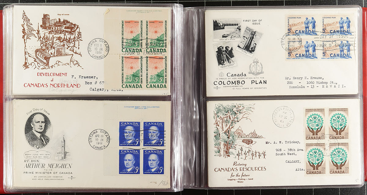 First Day Covers. An interesting assembly of 99 FDC from the 1957-1967 period, including primarily private illustrated cachets (a few with no cachet). A very clean assembly with almost all being either blocks of four, or plate blocks of four. Of particular note are the 1963 Export $1.00 high-value plate block and set of QEII Centennial mid-high value plate block FDC (including two different plate block corners of the 50c value). Estimate =