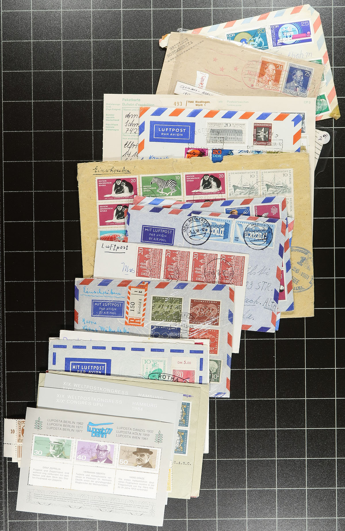 A mostly post-war German hoard from a substantial estate. Three sections here. 1. A group of Germany-Berlin used issues up to the early 1980's, sorted in #8 envelopes (with a few having Eastern, post-war "local post" issues). Secondly are about 50 covers from Germany and DDR (some on pages, some loose), mostly used to Canada which might help for someone doing a rate study. The last part is a spineless 16-page stockbook with an assortment of Germany and DDR stamps (and a couple of mint DDR booklet panes) 1930-1975. Offered as received. With lots of value here for someone looking to sit down and sort this out. Estimate =