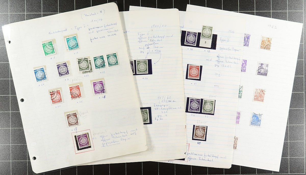 Part exhibit, part specialized collection, part accumulation of the 1953 design definitives and the 1950’s officials, plus a bit of later official stamps which are listed in Michel, but not Scott. A mix of mint and used, with different Michel listings (including differing paper types, perforations, watermarks). With singles, sets, and some of the later Michel-listed officials include covers. Finishes with a couple pieces of original correspondence between the collector and East German agencies (in German). Appears to have been untouched for 60 years! Perfect to expand your DDR collection. Housed in a one-inch binder. Estimate =