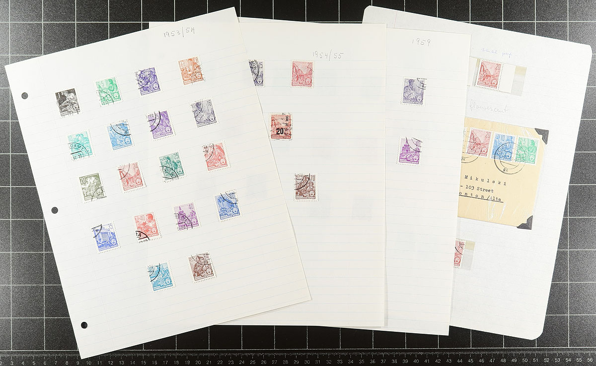 Part exhibit, part specialized collection, part accumulation of the 1953 design definitives and the 1950’s officials, plus a bit of later official stamps which are listed in Michel, but not Scott. A mix of mint and used, with different Michel listings (including differing paper types, perforations, watermarks). With singles, sets, and some of the later Michel-listed officials include covers. Finishes with a couple pieces of original correspondence between the collector and East German agencies (in German). Appears to have been untouched for 60 years! Perfect to expand your DDR collection. Housed in a one-inch binder. Estimate =
