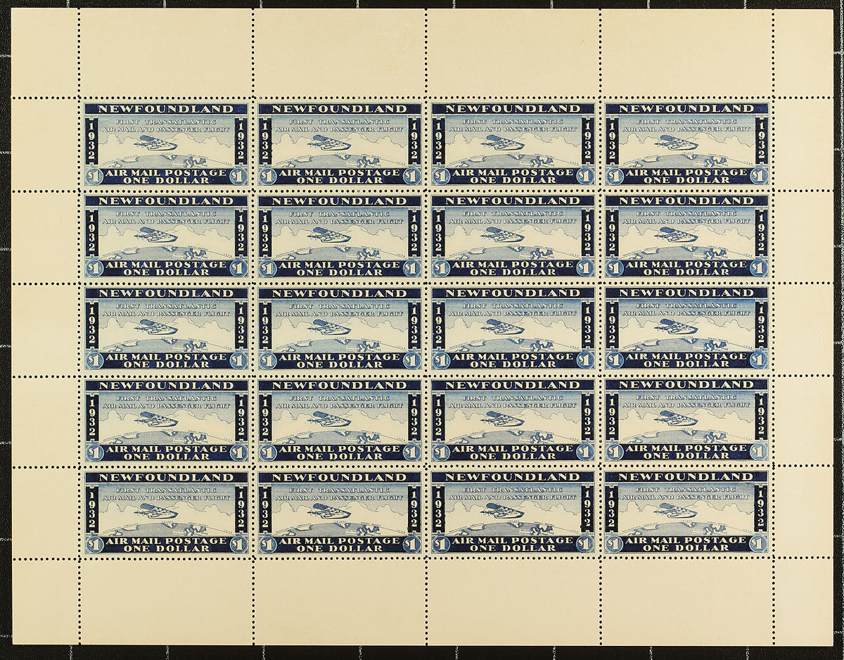 Wayzata Airmail. Archivally fresh and VF mint Never Hinged complete sheet of 20 of the famous Wayzata airmail. The so-called "Wayzata Airmail" $1.00 stamp was issued in August 1932 to fund an historic flight from Wayzata, Minnesota to England. The flight never took place. This issue is mentioned and priced in a footnote in Scott. Seldom offered in complete sheets. Priced as 20 singles, but certainly worth more as a sheet. 2025 Scott US$700.00 =