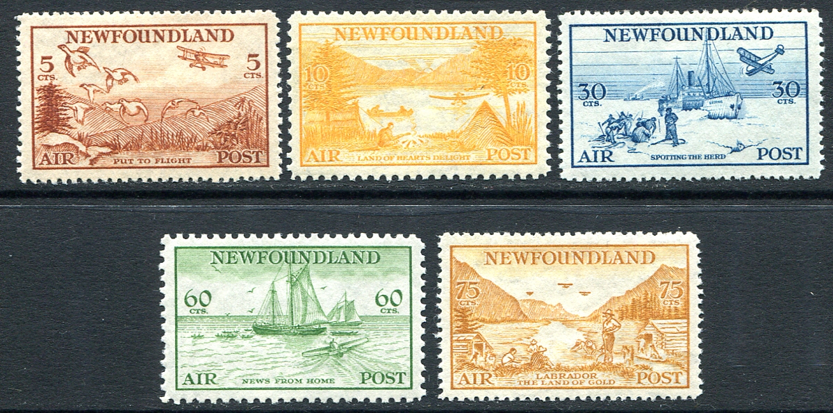 VF mint Never Hinged complete set of five of the 1933 issue Labrador airmails. Great vibrant colours and all are extremely well centered. As nice a set as we have handled. Unitrade is $455.00 for the VF mint NH set. 2025 Scott US$270.00 =