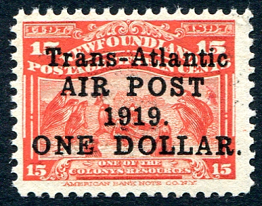 F/VF mint Never Hinged example of the 1919 issue $1.00 overprint on the 15c scarlet "Seals" Trans-Atlantic airmail without comma after "Post". Only 2,800 printed. 2025 Scott US$360.00 =