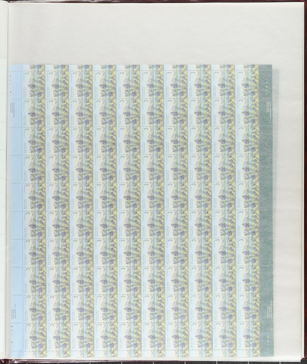 Mint Sheet Holding. An eclectic mix of 27 complete sheets (plus several incomplete sheets) from the 1950's to 1990's arranged within a deluxe padded "Modern Large Mint Sheet File". Several tougher to find sheets including 45c "Flag over Building" and "Edible Berries" definitives, as well as 1950's Prime Ministers and 1980's ART Canada. A diverse and useful mix of material here! Conservatively valued for the total usable face value only. Total face value =