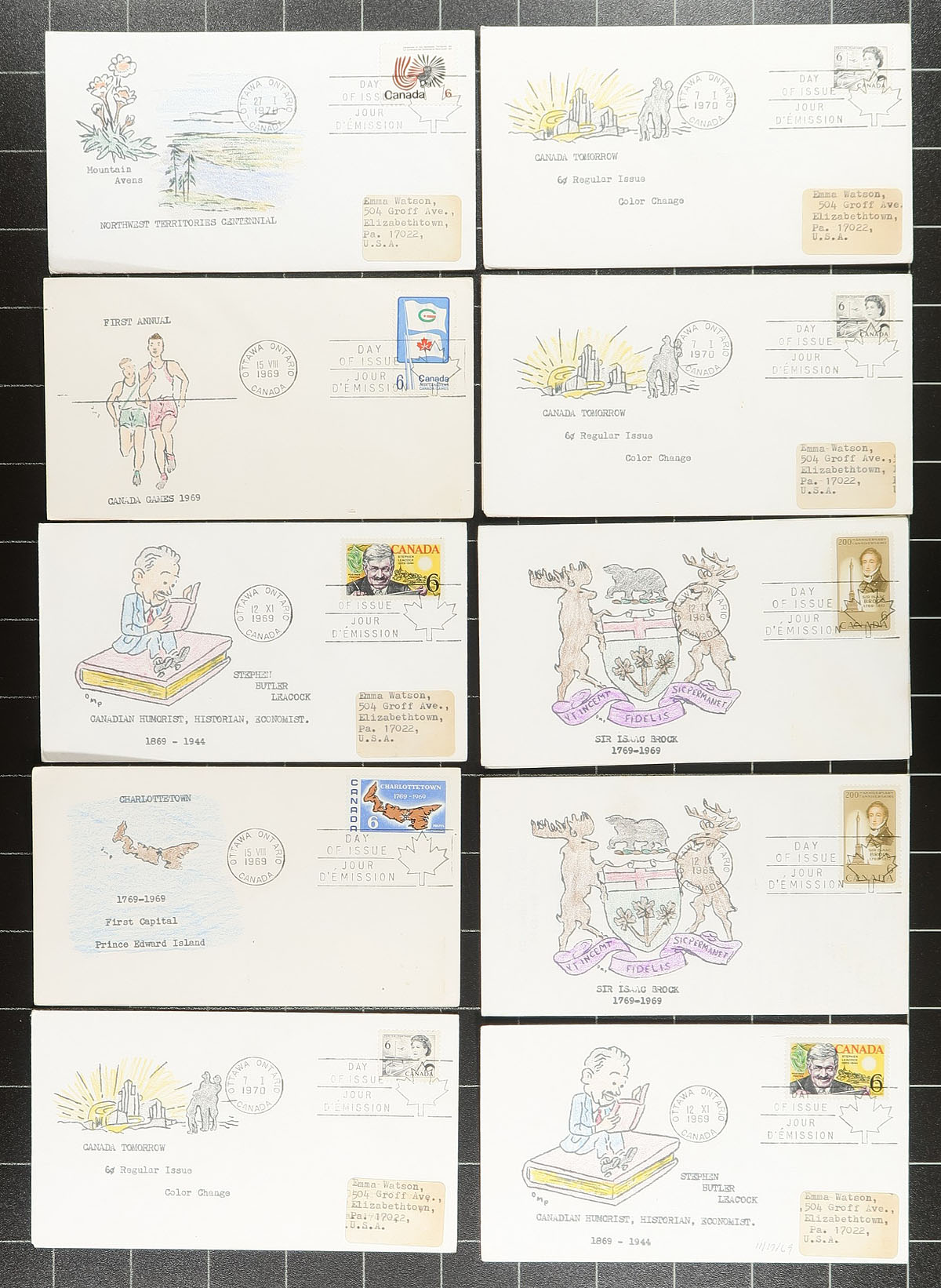 First Day Covers. An attractive assembly of 33x "David C" hand-coloured cachet FDC from the 1969-1972 period. These covers were furnished by David Pritchard of Fort Thomas, Kentucky USA, who started his cachet service in 1967, naming the cachet "David C" after his son, David Charles who was born the same year. Lightly duplicated, but a seldom offered larger group from this sometimes elusive American cachet maker. Estimate =