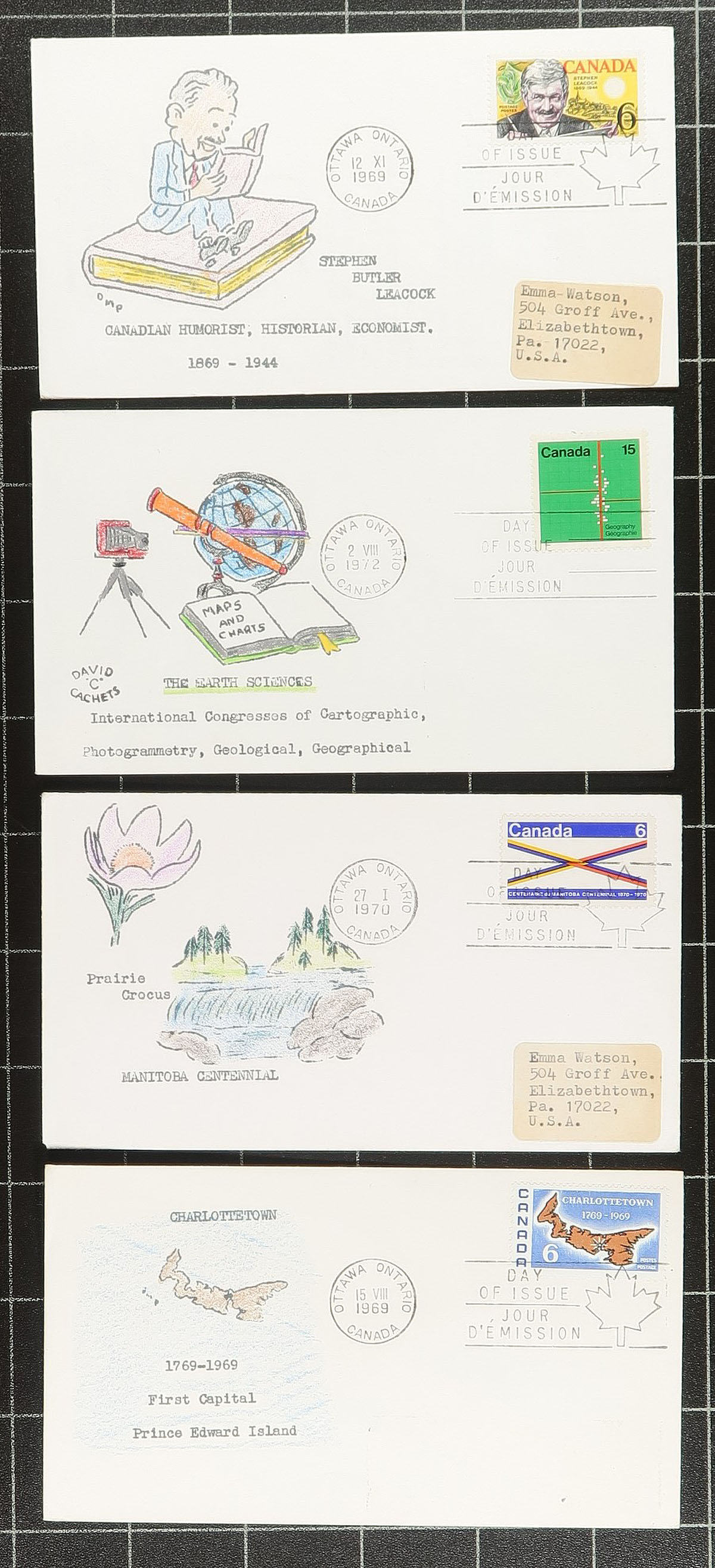 First Day Covers. An attractive assembly of 33x "David C" hand-coloured cachet FDC from the 1969-1972 period. These covers were furnished by David Pritchard of Fort Thomas, Kentucky USA, who started his cachet service in 1967, naming the cachet "David C" after his son, David Charles who was born the same year. Lightly duplicated, but a seldom offered larger group from this sometimes elusive American cachet maker. Estimate =